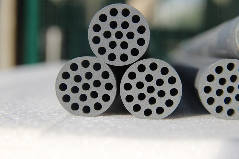 Keramiske membraner i siliciumcarbid er blevet ideelle materialer til høj-temperaturgasrensning på grund af deres høje temperaturresistens (op til 800 ° C), termisk chokresistens og kemisk inertitet. De fjerner effektivt partikler, såsom PM2.5 gennem pore-screening og overfladeadsorptionsmekanismer, og er blevet vidt brugt i høje temperatur røggasbehandling i kulkemikalie-, polysilicium- og stålindustrier. For eksempel opnår siliciumcarbidmembraner i den aktiverede koks-desulfuriseringsproces i koksindustrien ikke kun en partikelopbevaringshastighed på over 99%, men øger også det specifikke overfladeareal gennem poremodificeringsteknologi, belastning af katalysatorer for at opnå støvfjerningskatalyseintegration og samtidig nedbryde forurenende stoffer, såsom NOX, hvilket reducerer driften af vedligeholdelse og vedligeholdelse.
