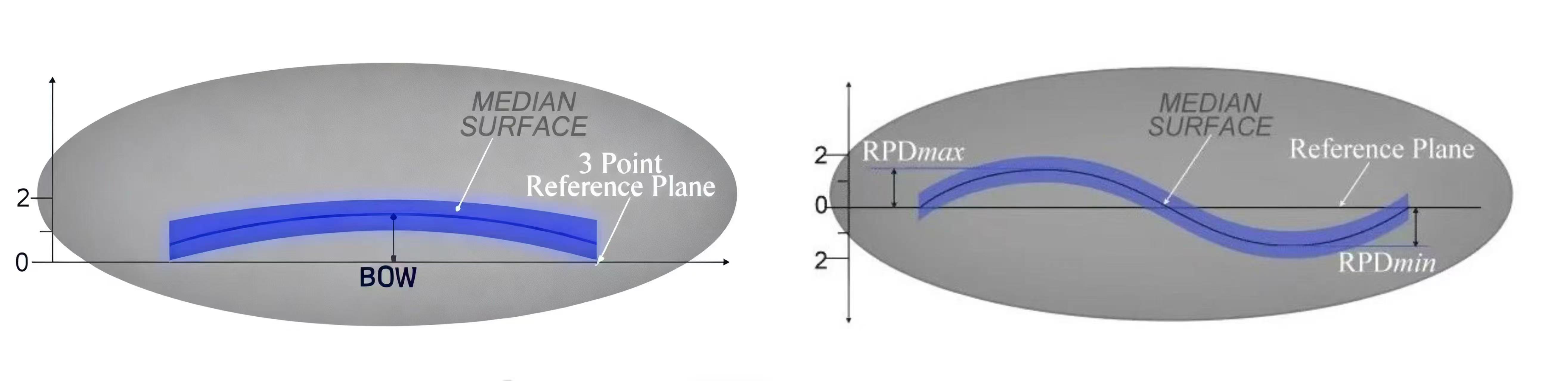 Bueindikatoren fokuserer på den lodrette forskydning af waferens centerområde, som kun afspejler den lokale bøjningstilstand. Den er velegnet til at evaluere scenarier, der er følsomme over for lokal fladhed. Warp-indikatoren er nyttig til at vurdere den samlede fladhed og forvrængning, fordi den tager højde for afvigelsen af hele waferoverfladen og giver information om den samlede fladhed for hele waferen.