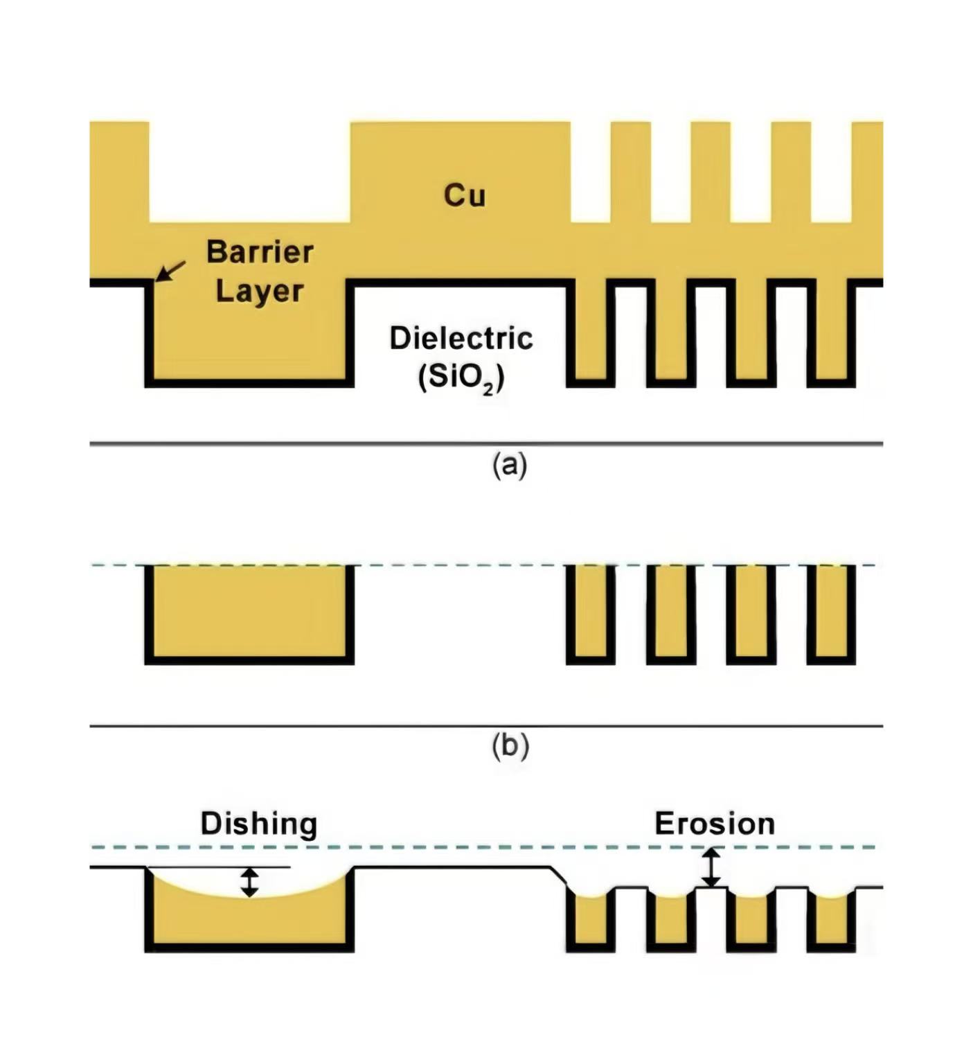 Dishing betyder overpolering af blødere materialer (som kobber) under CMP-processen, hvilket resulterer i lokale skiveformede centrale fordybninger. Dette fænomen, der er almindeligt i brede metallinjer eller store metalområder, stammer primært fra uoverensstemmelser i materialets hårdhed og ujævn mekanisk trykfordeling. Dishing er primært kendetegnet ved en fordybning i midten af en enkelt bred metallisk linje, hvor fordybningens dybde typisk stiger med linjebredden.