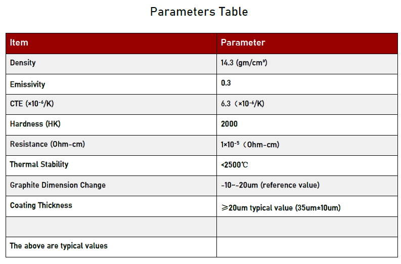 Tantalcarbid er højtydende materiale med et ekstremt højt smeltepunkt (ca. 3880 ℃), fremragende termisk ledningsevne, overlegen kemisk stabilitet og enestående mekanisk styrke. De specifikke præstationsparametre er som følger:
